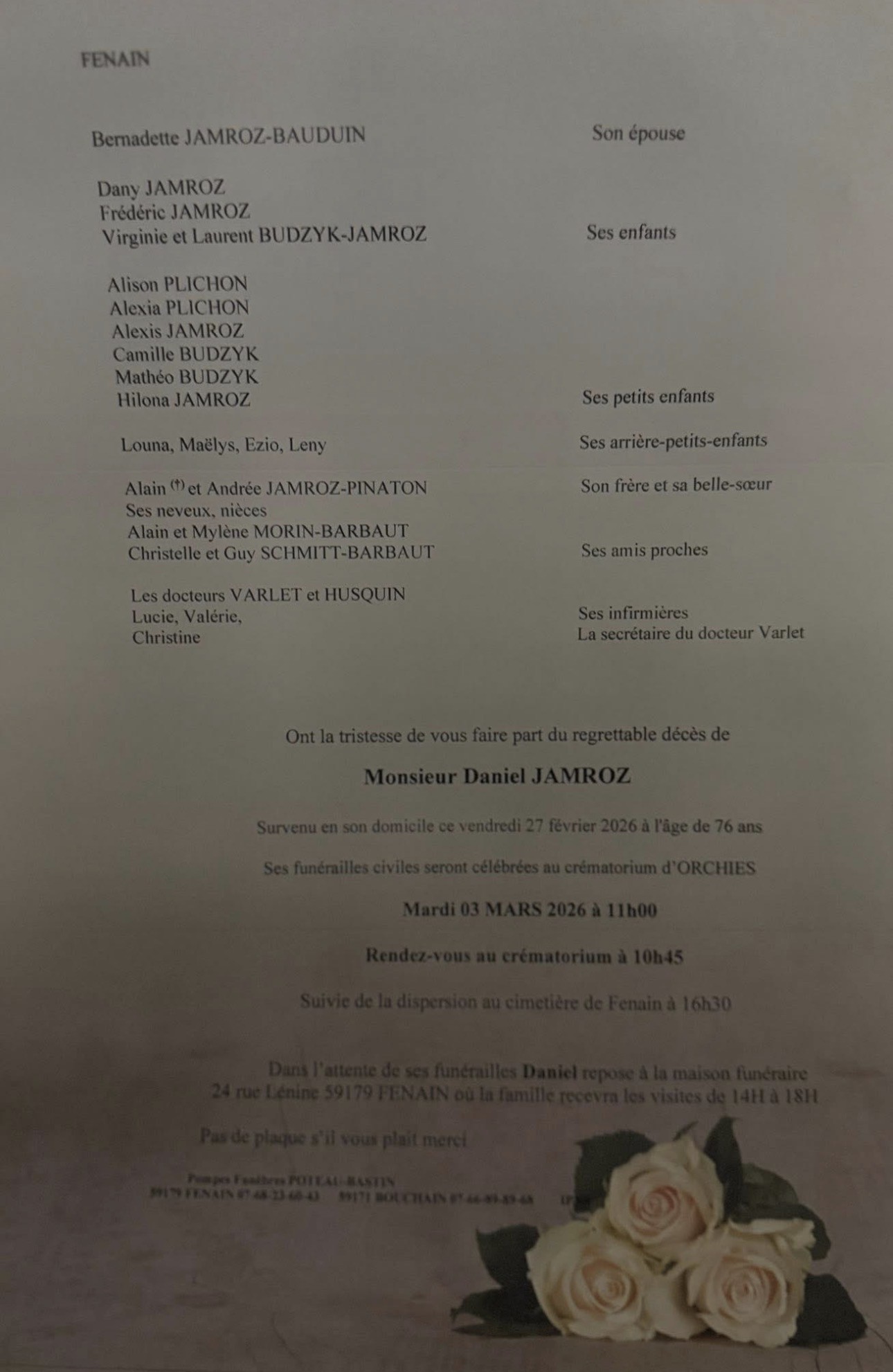 Déroulement des funérailles de Monsieur DANIEL JAMROZ